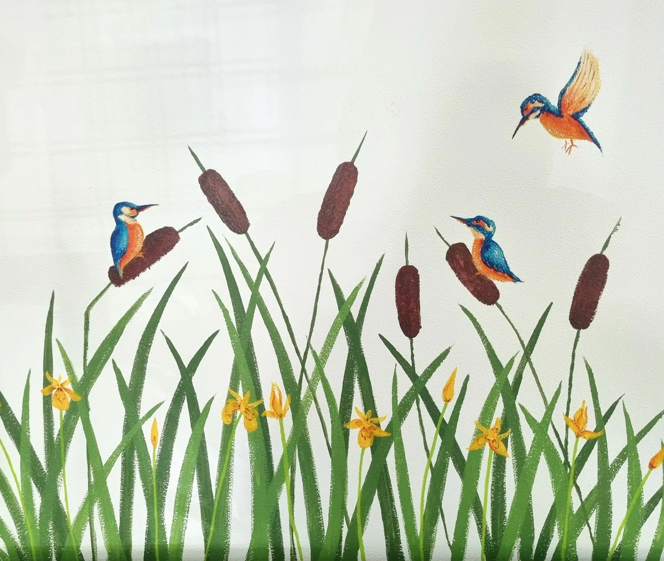 De klant wilde graag iets om haar eetkamer op te fleuren. Haar wensen waren redelijk vrij, iets met vogels en iets met groen. IJsvogeltjes waren een favoriet en gezien ik maar al te graag kleurrijke dingen schilder, ging ik daar graag op in! Uiteindelijk zijn we op dit ontwerp gekomen met ijsvogels in het riet.